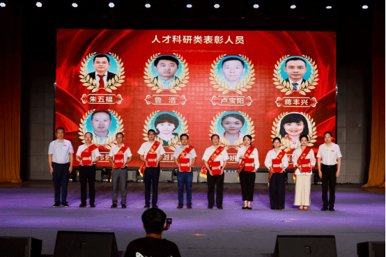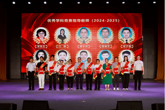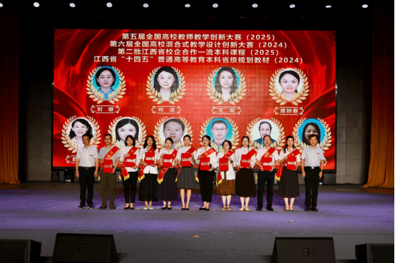 在热烈的掌声中,校领导为受到表彰的集体和个人颁发了奖牌和证书,包括青年长江学者1人,人才科研类表彰人员8人,第五届全国高校教师教学创新大赛(2025)、第六届全国高校混合式教学设计创新大赛(2024)、第二批江西省校企合作一流本科课程(2025)、江西省“十四五”普通高等教育本科省级规划教材(2024)获奖者10人,优秀学科竞赛指导教师31人,综合类成果奖21人。