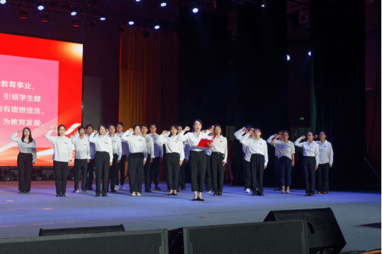 与会教师与24名新教师代表一道重温人民教师誓词。铮铮誓言,是新教师的事业起点、郑重承诺,更是每一位老教师的教育初心、深情告白。