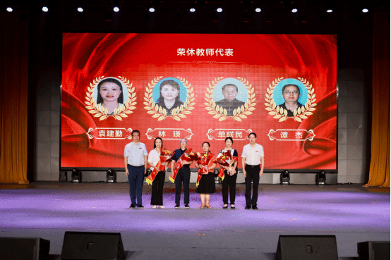 裴鸿卫、袁雄为退休教师代表献上了鲜花,感谢其为学校教育事业发展作出的贡献。